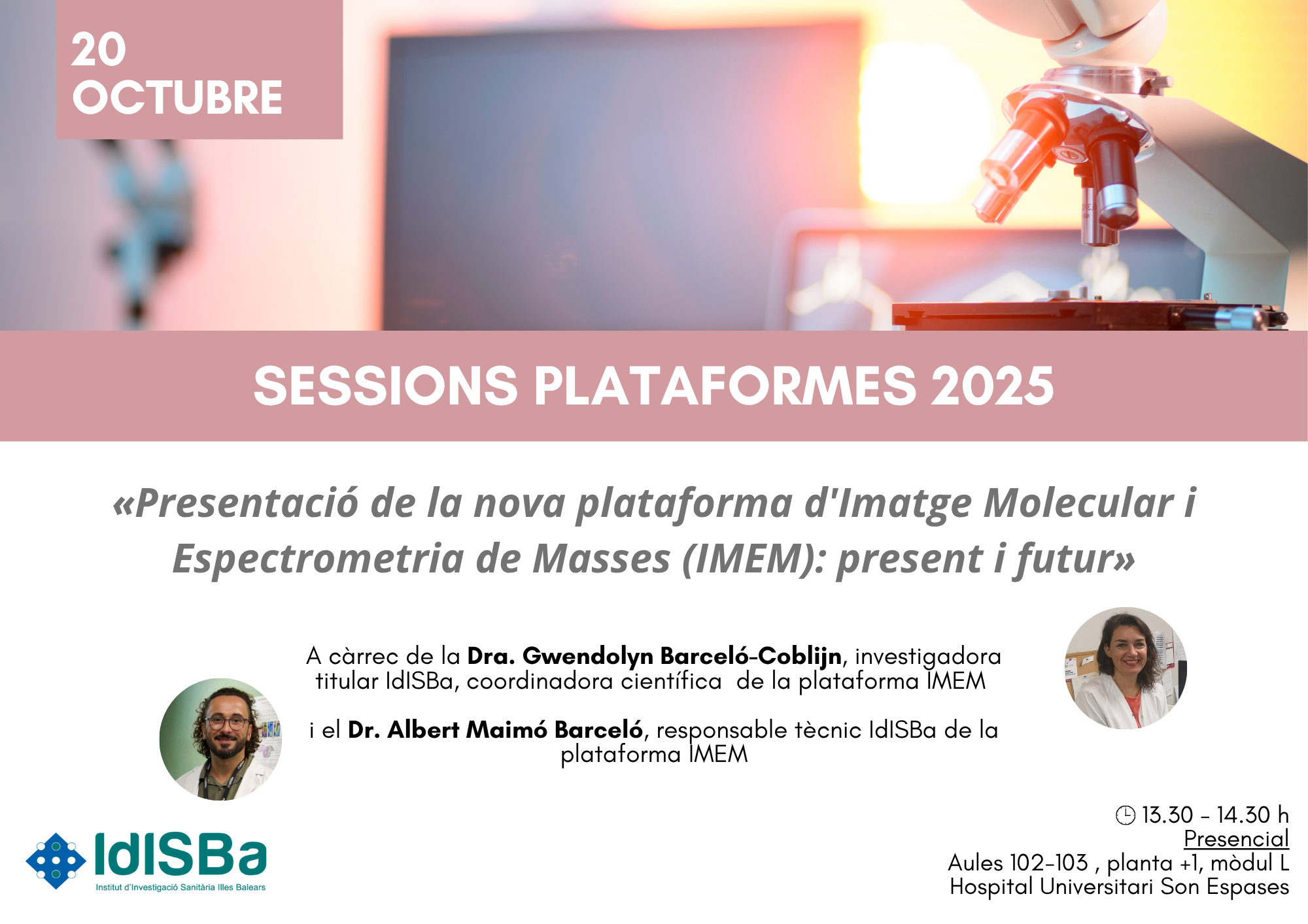 El dilluns 20 d’octubre  a les 13:30 hores, les aules 102-103 de l'Hospital Universitari Son Espases acolliran el seminari Plataformes IdISBa « Presentació de la Nova Plataforma d'Imatge Molecular i Espectroscopia de Masses (IMEM): present i futur», a càrrec de la Dra. Gwendolyn Barceló-Coblijn, investigadora titular IdISBa, coordinadora científica de la Plataforma d'IMEM  i el Dr. Albert Maimó Barceló, responsable tècnic IdISBa de la Plataforma d'IMEM