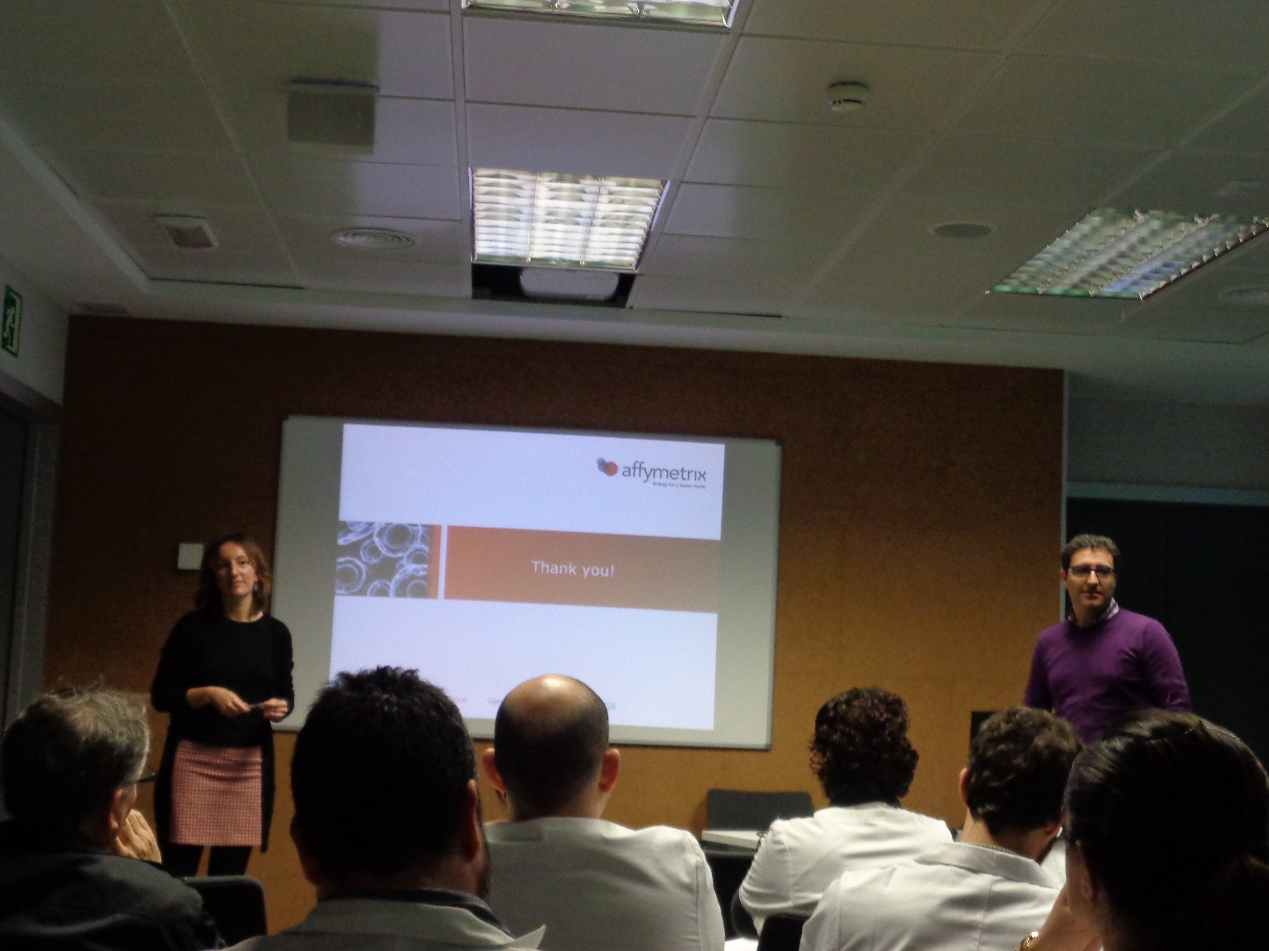 El pasado día 27 de febrero se realizó la presentación de los servicios de la “Plataforma de Genómica” a cargo del personal de apoyo de la misma, el Dr. Víctor Asensio conjuntamente con la Dra. Elena Aller, especialista técnica de Affymetrix.