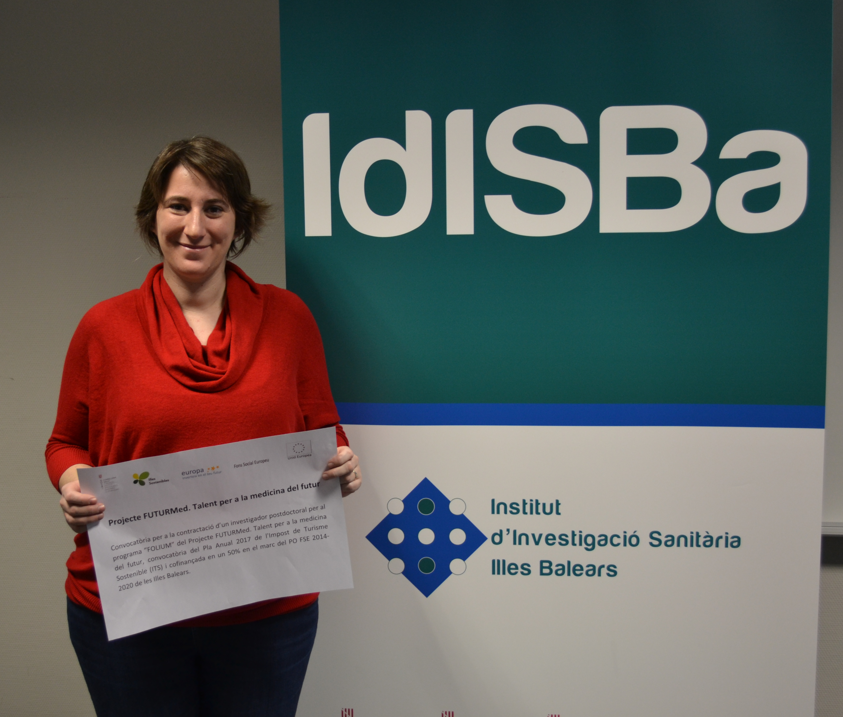La Dra. Elena Jordana Lluch se incorpora al IdISBa a través de la convocatoria para la contratación de un investigador postdoctoral para el programa "FOLIUM" del Proyecto FUTURMed. Talento para la medicina del futuro, convocatoria del Plan Anual 2017 del Impuesto de Turismo Sostenible (ITS) i cofinanciada en un 50% en el marco del PO FSE 2014-2020 de las Islas Baleares.