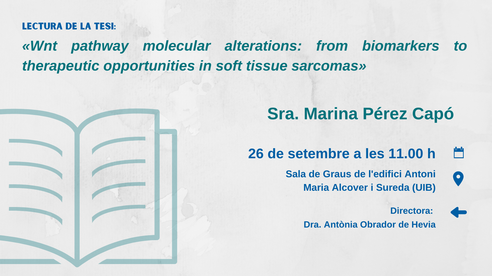 El viernes 26 de septiembre, a las 11:00 horas, la Sra. Marina Pérez Capó defenderá su tesis doctoral en la Universidad de las Islas Baleares. Su trabajo de investigación se ha realizado bajo la dirección de la Dra. Antonia Obrador De Hevia, responsable del grupo Terapias Avanzadas y Biomarcadores en Oncología Clínica.